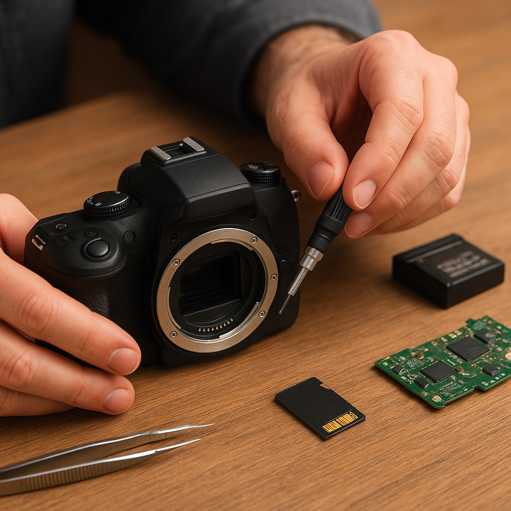 Po eliminacji kwestii zasilania przejdź do sprawdzenia wewnętrznych połączeń i elementów modułu głównego. W większości lustrzanek oraz bezlusterkowców dostęp do wnętrza wymaga odkręcenia kilku śrubek i ostrożnego odseparowania panelu tylnego od korpusu.