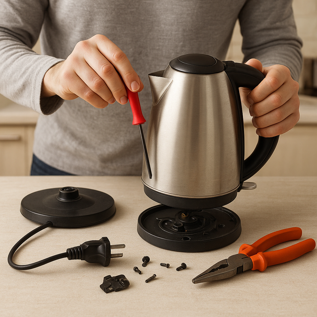 Odłącz czajnik od sieci i pozostaw do ostygnięcia. Usuń elementy plastikowe i dolną pokrywę, odkręcając wszystkie widoczne śruby. Zachowaj ostrożność, aby nie uszkodzić przewodów.