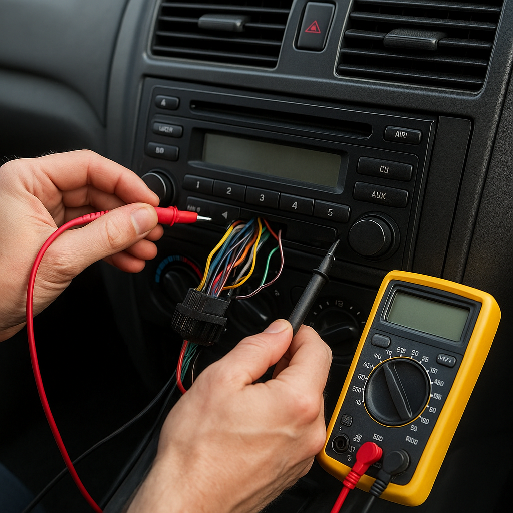 - Zmierz napięcie na wtyczce radia – powinno wynosić około 12 V przy włączonym zapłonie.