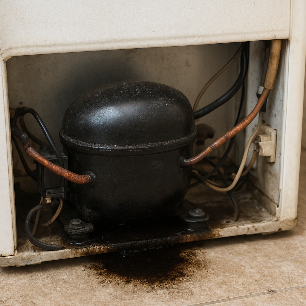 - Wycieki czynnika – plamy oleju lub delikatne mikroskopijne kropelki pod urządzeniem.